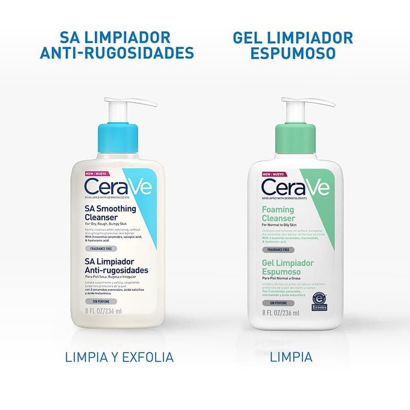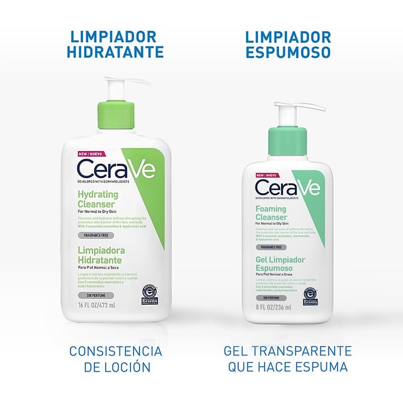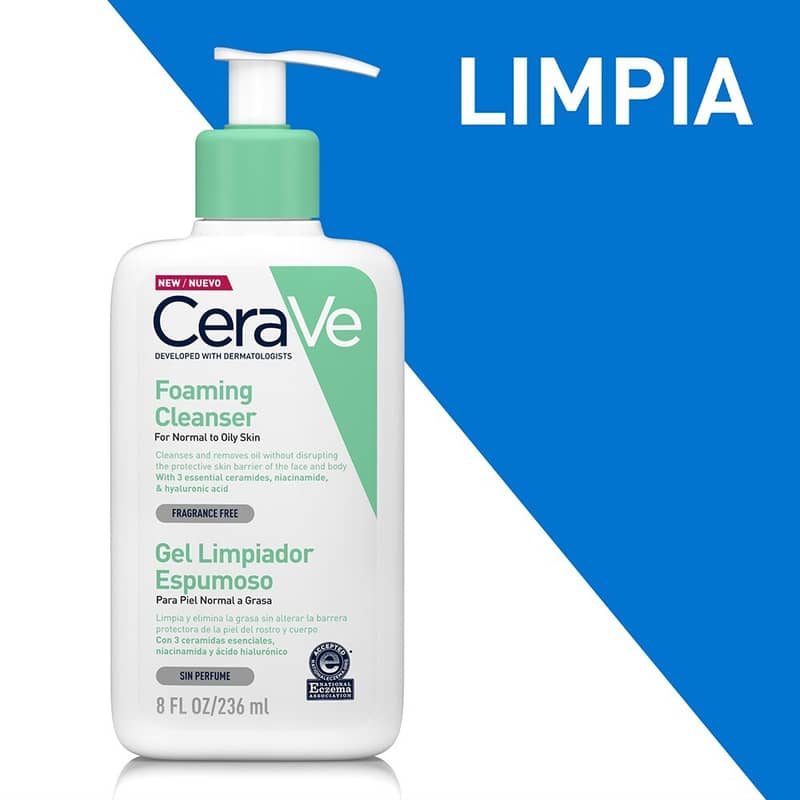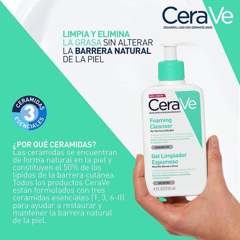 Gel Limpiador espumoso de Cerave crea espuma suave para limpiar profundamente el rostro y el cuerpo, sin alterar la barrera natural de la piel.