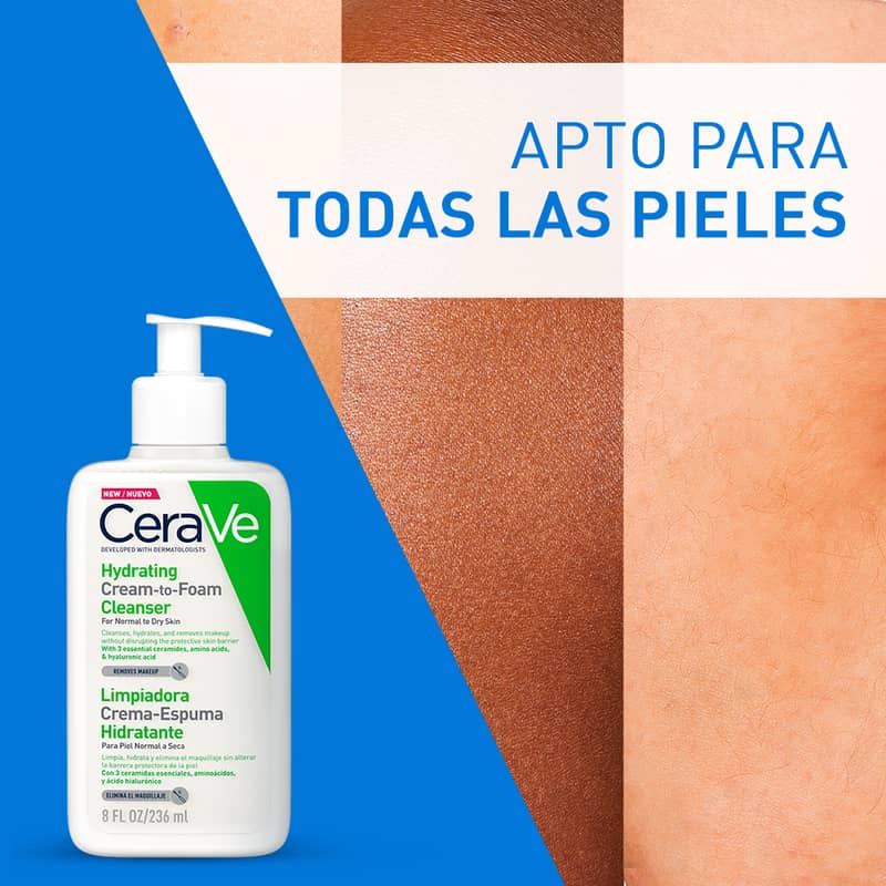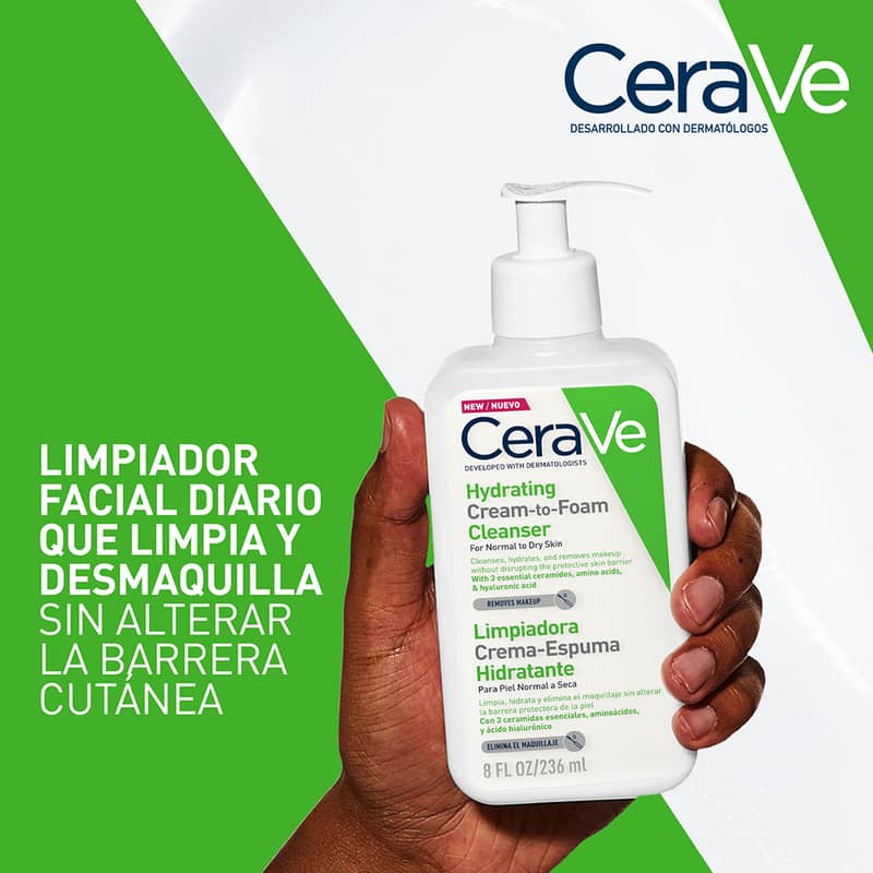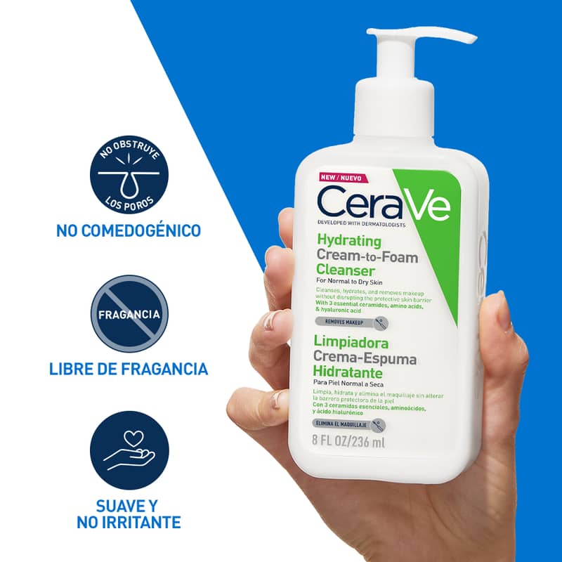 El Limpiador hidratante de crema a espuma CeraVe comienza como una crema antes de transformarse en una suave espuma cuando se empieza a hacer espuma sobre la piel con agua, y elimina eficazmente la suciedad y el maquillaje sin eliminar la humedad natural de la piel ni dejarla tirante y seca. Esta fórmula suave y sin perfume contiene tres ceramidas esenciales, aminoácidos y ácido hialurónico, que trabajan juntos para ayudar a mantener la barrera de la piel y retener la humedad.