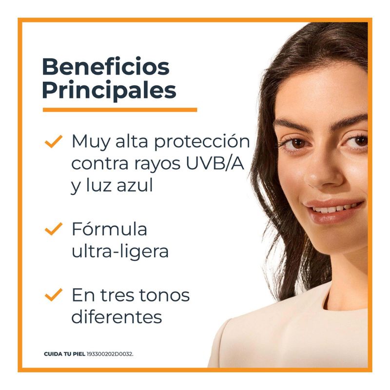 Eucerin Hydro Fluid FPS 50+ con color está formulado con AOX Shield Technology, que ayuda a mejorar las defensas de la piel ante la luz azul. Su fórmula ultra-ligera, está enriquecida con antioxidantes que previenen el daño solar. Protector solar facial líquido ultraligero para todo tipo de pieles, incluso la piel sensible. Muy alta proteccion solar FPS50+ con pigmentos de color aumentan la defensa contra la luz azul.