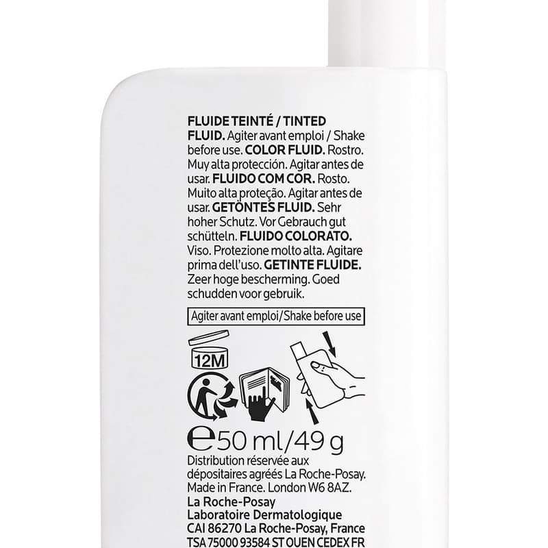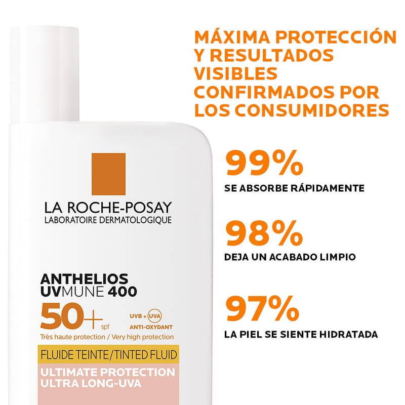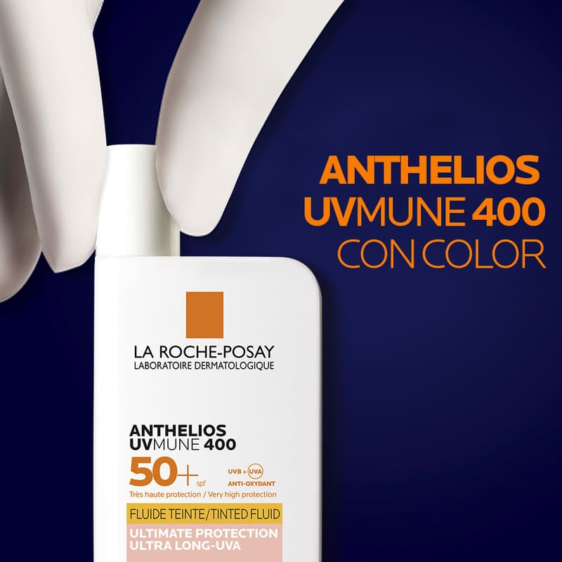 Anthelios Fluido con Color SPF 50+ de La Roche-Posay, marca recomendada por dermatólogos. Protege contra los rayos UVB/UVA. Nuevo filtro Mexoryl 400: Protege contra los rayos UVA ultra largos* [380-400nm]. Textura ligera con acabado invisible no graso. No deja marcas blancas. Muy resistente al agua, sudor y arena. Para pieles normales a secas.
