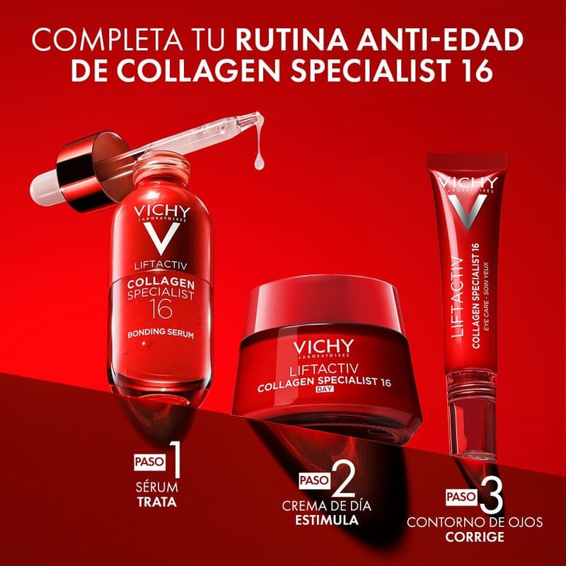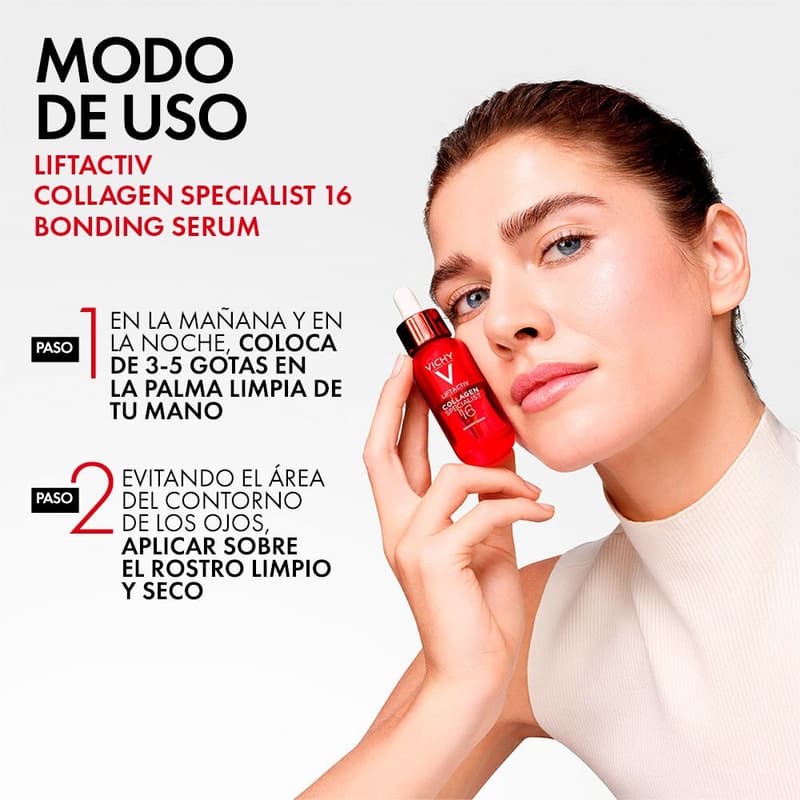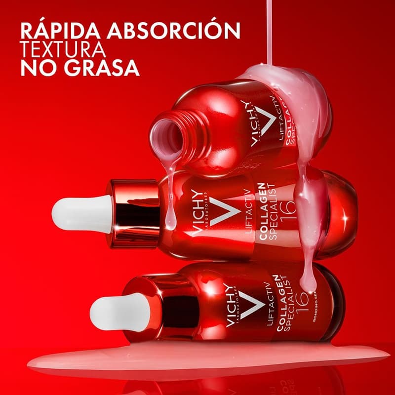 Sérum antiedad que corrige 16 signos de la edad. Potencia y une todas las familias del colágeno gracias a sus ingredientes y tecnología Co-Bonding. Su textura es no grasa y de rápida absorción. Fórmula hipoalergénica y apto para pieles sensibles.